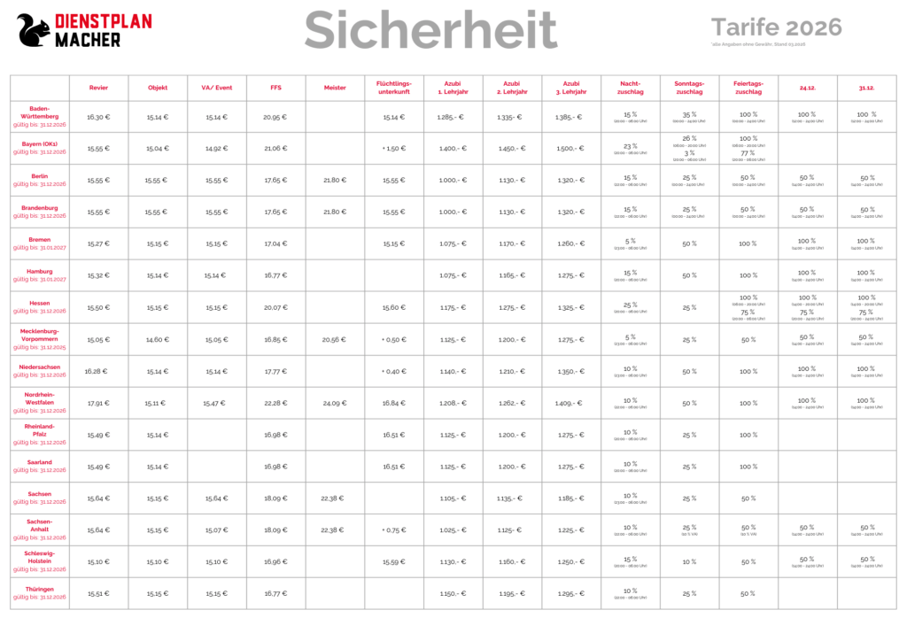 Für Beschäftigte in der privaten Sicherheitswirtschaft bringt das Jahr 2026 echte Veränderungen bei den Tariflöhnen. Nach mehreren Tarifrunden und Vereinbarungen steigen die Entgelte in nahezu allen Bundesländern deutlich an, was vor allem angesichts steigender Lebenshaltungskosten eine wichtige Nachricht ist.